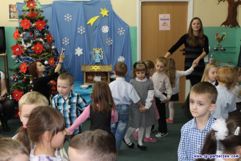 Gospodarzy spotkania (klasę 0a) także odwiedzili, życzenia złożyli i do wspólnego "kolędowania wokół choinki" się włączyli koledzy i koleżanki z klasy I i II a.